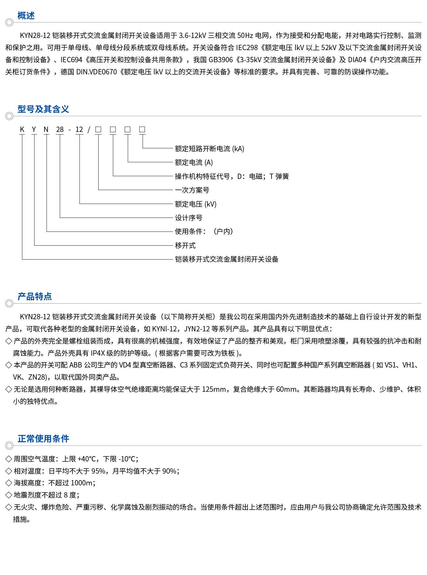KYN28-12鎧裝移開式交流金屬封閉開關(guān)設(shè)備適用于3.6-12kV三相交流50Hz電網(wǎng),作為接受和分配電能,并對電路實行控制、監(jiān)測和保護之用。可用于單母線、單母線分段系統(tǒng)或雙母線系統(tǒng)。開關(guān)設(shè)備符合IEC298《額定電壓kW以上52kW及以下交流金屬封閉開關(guān)設(shè)備和控制設(shè)備》、IEC694《高壓開關(guān)和控制設(shè)備共用條款》,我國GB3906《3-35kV交流金屬封閉開關(guān)設(shè)備》及DIA04《戶內(nèi)交流高壓開關(guān)柜訂貨條件》,德國DN.VDE0670《額定電壓kV以上的交流開關(guān)設(shè)備》等標準的要求。并具有完善、可靠的防誤操作功能。